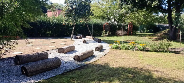 Ogród wokół przedszkola jest niezwykłym miejscem, w którym prowadzone są zajęcia edukacyjne, sportowe i rekreacyjne. W ogrodzie znajdują się sprzęty do zabaw rekreacyjnych, ćwiczeń fizycznych, piaskownice, ławeczki i altany. W ogrodzie znajduje się również punkt dydaktyczny ,,Zatoka Odkrywców”, w którym zachęcamy dzieci do wielozmysłowego poznawania przyrody. W ramach inicjatywy lokalnej społeczności przedszkolnej w roku 2023 ogród został doposażony o nowy sprzęt rekreacyjny “Statek odkrywców”. W roku 2024 powstały „Sensorysie – kreatywna strefa przedszkolaka” wyposażona w kuchnie błotne oraz fabrykę piasku.